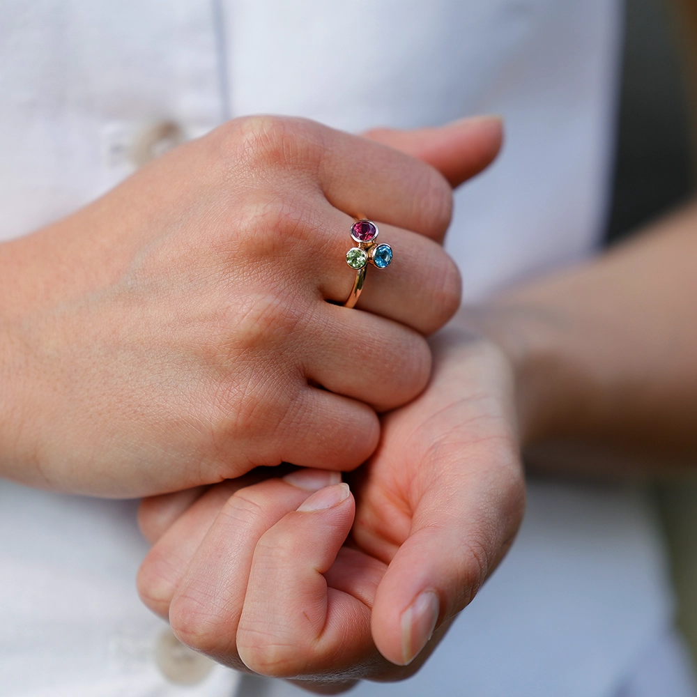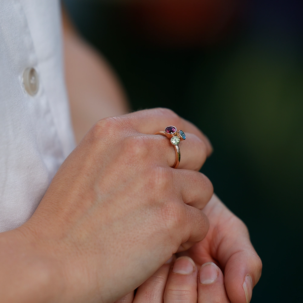 A beautiful trio of Peridot, Blue Topas and Rhodolite set in an 18ct rose gold ring.