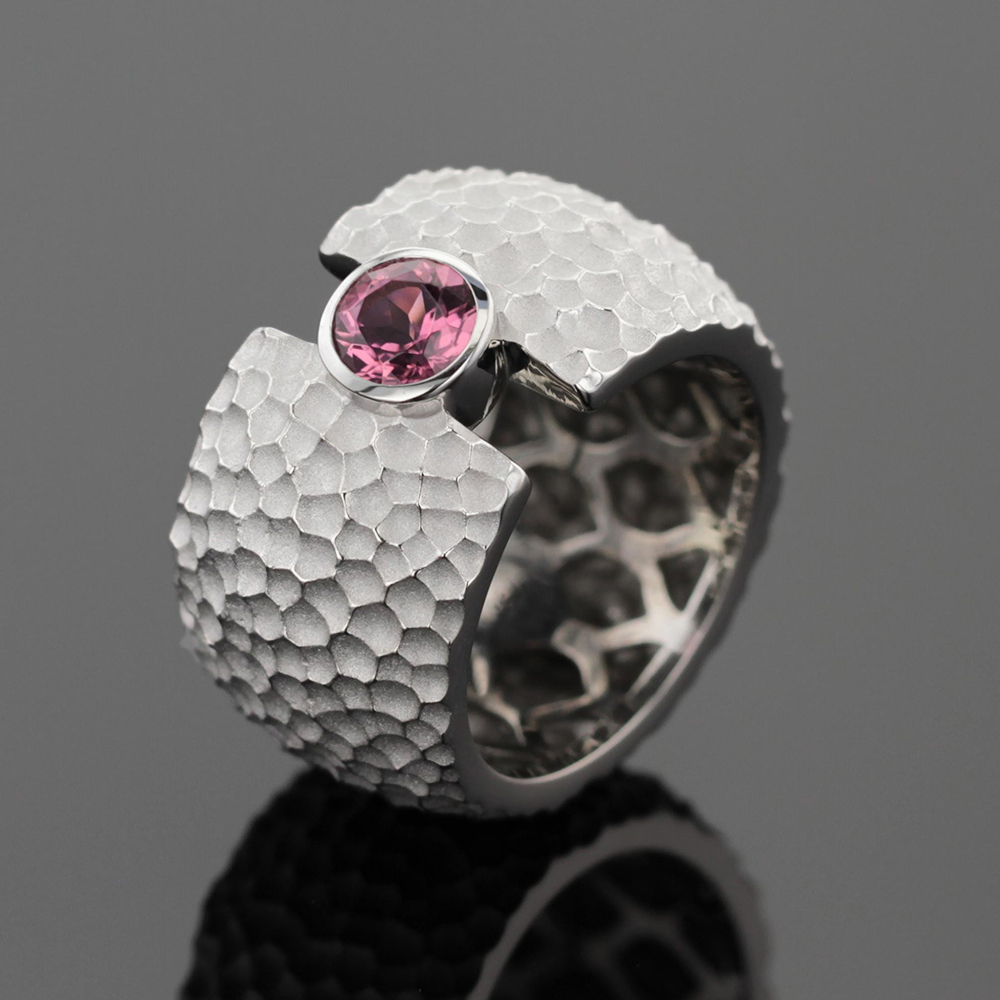Crafted in 18ct white gold, this unique statement ring features a raw rock-texture and a sparkling Pink Tourmaline.