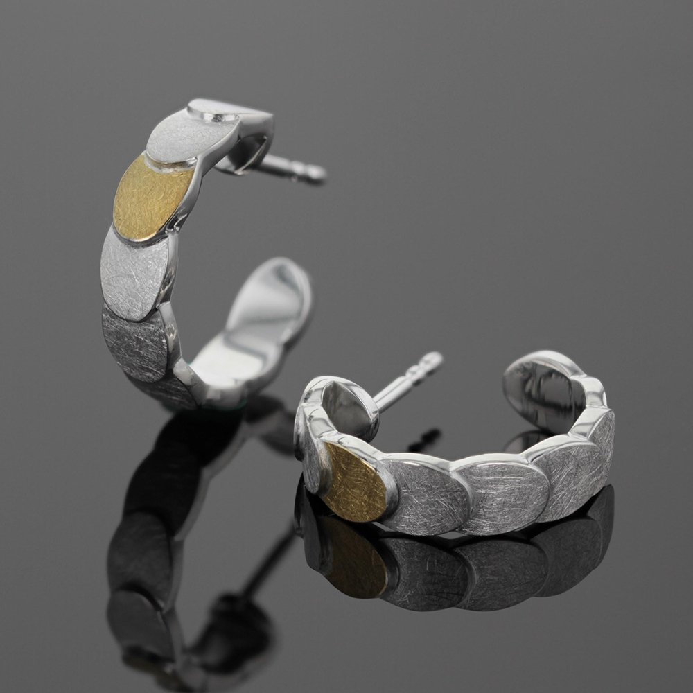 Modern creole earrings with slightly overlapping segments in brushed sterling silver with a yellow gold element.